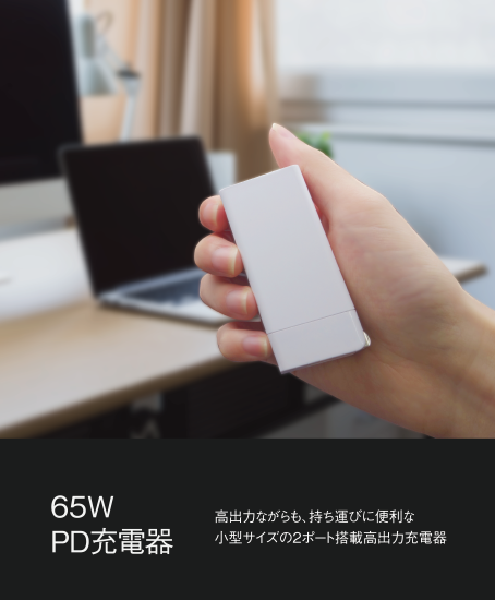 新素材GaN(窒化ガリウム) を採用した、世界最小最軽量クラスの65W急速充電器です。収納しやすい折りたたみ式プラグ付きで、小型軽量のため、様々なモバイル機器と一緒に気軽に持ち運ぶことができます。