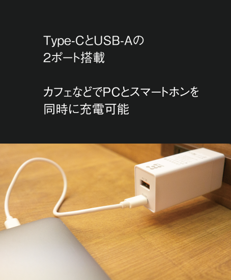 PD3.0対応のUSB-CポートとQC3.0対応のUSB-Aポートを搭載しており、ノートPC、タブレット端末のようなUSB-C機器と、スマホやその他USB機器の計2台を同時に急速充電することができます。